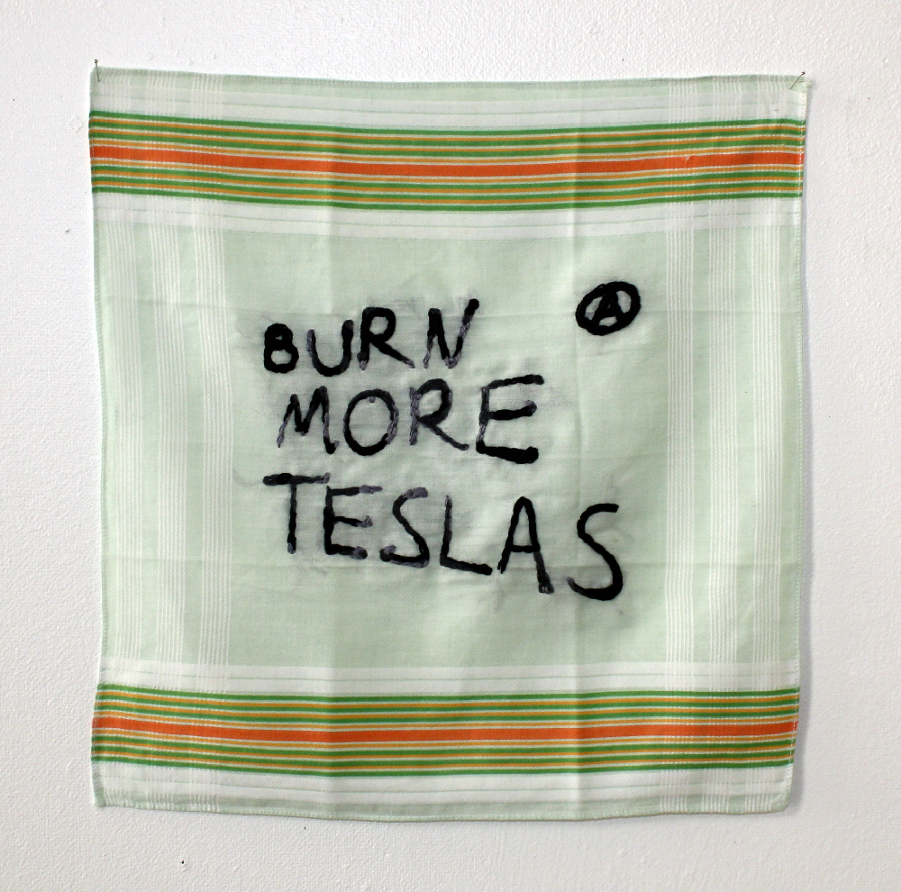 “Burn more teslas” (série “les pleurs de l’aube”), broderie sur mouchoir, 29 x 30 cm, 2025.