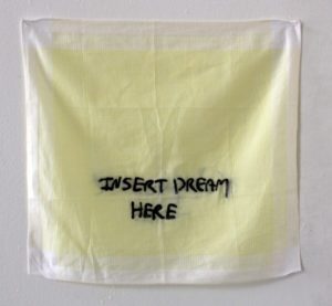 “Insert dream here” (série “les pleurs de l’aube”), broderie sur mouchoir, 36 x 33 cm, 2025.